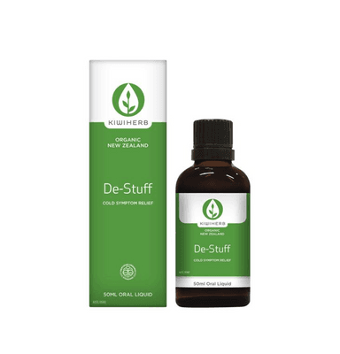 KiwiHerb De-Stuff is a pleasant tasting formula designed specifically for the symptomatic relief of mild upper respiratory tract infections, and may reduce the severity and duration of colds. Made from certified organic Elderflower, Echinacea root, Peppermint and Ribwort, this formula has a natural, fresh minty taste.