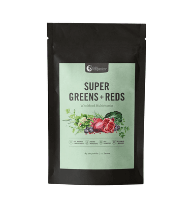 Plus, with a synbiotic blend containing prebiotics and probiotics to support digestive health^, plant protein and a restorative & cleansing herbal blend, Super Greens + Reds is the most comprehensive, potent & bioavailable multivitamin formula using only natural wholefood sources.
